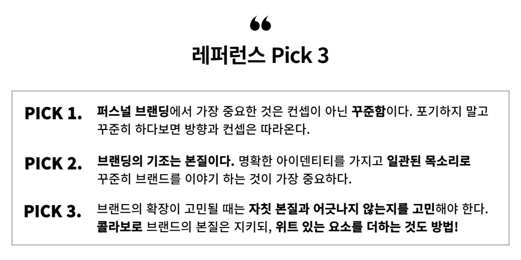 그 브랜드가 잘하는 것과 좋아하는 것이 있는데 어떤 것이 더 고객들에게 사랑 받고 있는지를 잘 판단해보면 잘하는 것일 가능성이 큰데요. 잘하는 것을 어떻게 더 고객들에게 진정성 있게 보여줄 것인가에 대한 소구 포인트를 더 연구하고, 본질을 더 탐구했으면 좋겠습니다.
