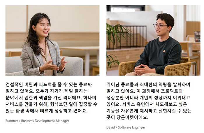 또한 각 부서의 리더들이 어떻게 성장하고 있는지 소개하고 있습니다. 동료들과 발맞춰 나가는 의사소통의 마인드 셋, 일하는 방법 등이 담겨있는데요. 함께 일하고 싶은 동료상을 알 수 있죠. 리더 덕분에 업무 스킬이 성장한다고 느끼는 직원이 많으므로 ‘상사 간의 관계’를 위해서라도 상사의 생각을 소개하는 것은 필수적이겠죠? 채용을 위한 기업의 브랜딩 과정은 중요합니다!
