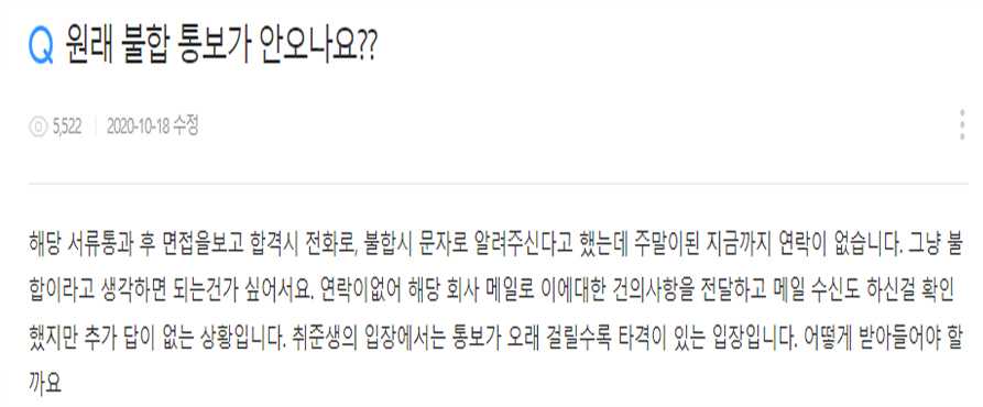 출처: 잡코리아 홈페이지 취업톡톡, 통보가 늦거나 하지 않는 회사는 지원자에게 나쁜 인상을 심어줄 수있음.