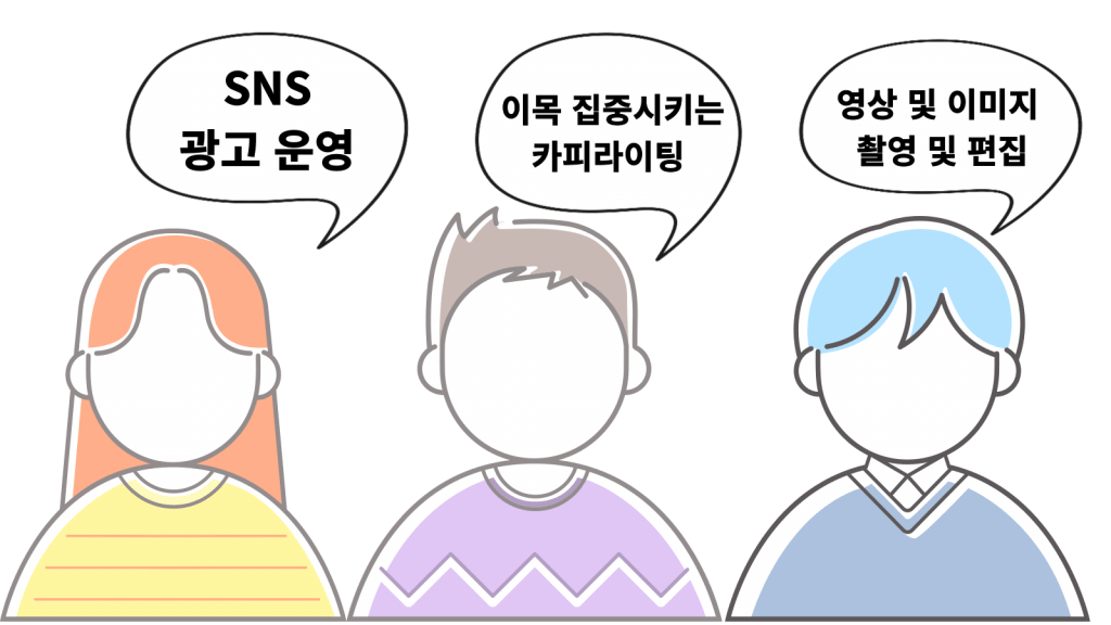 사이드 프로젝트가 ‘마케팅 인사이트 계정 운영하기’ 라고 예를 들어봅시다. ‘구독자’님은 마케팅 진행 프로세스를 명확히 알고 있어 광고 운영에 뛰어나요. 반면 친구 A는 영상 및 이미지 촬영 및 편집에 뛰어납니다. 그리고 친구 B는 사람들을 이목 집중시키는 카피라이팅 실력을 가지고 있어요.
