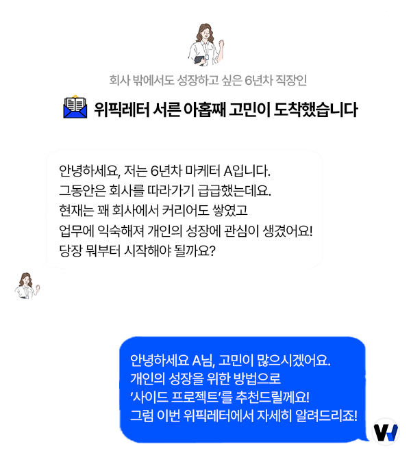 구독자님, 회사라는 울타리를 넘어 업무 경험을 더 확장하고 싶지 않으신가요? 지금 당장 사이드 프로젝트를 시작해보세요! 개인의 발전과 자아실현을 위해서 사이드 프로젝트를 시작하는 것은 매우 유의미한 일입니다. 목표를 세우고 달성하기 위해 노력을 하는 것은 큰 성취감을 주죠. 나를 위한 가치 창출 활동이에요!📚
