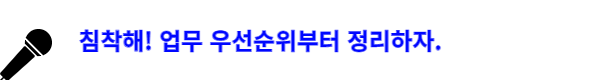 집중도 안되고 마음만 쫓길 때는, 일단 눈앞에 업무를 내려 놓으세요. 닥치는 대로 처리 하다가는 불필요한 업무에 집중하게 되거나, 중요한 업무를 놓칠 수 있어요. 우선 업무를 하기 전 팀의 전체적인 상황을 이해하고 작업 시간을 분배하는 것이 중요합니다! 일단 상황 판단이 안될 때는 리더를 찾아가 우선순위를 정리하세요. 업무는 회사의 큰 맥락 안에서 이뤄져야 하기 때문입니다!