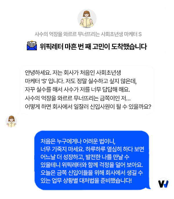 고민자님의 회사 일상을 따라, 신입 금쪽이들이 가질 만한 고민을 짧고 굵게 해결해보았습니다! 인턴이나 수습으로 회사 생활 중인 사회초년생 분들! 이외에도 각자 다양한 고민을 가지고 계실 텐데요. 저희 위픽레터에서 회사 생활의 고민 해결을 위한 익명 커뮤니티 <👾억장파괴단👾>을 오픈했습니다!💨