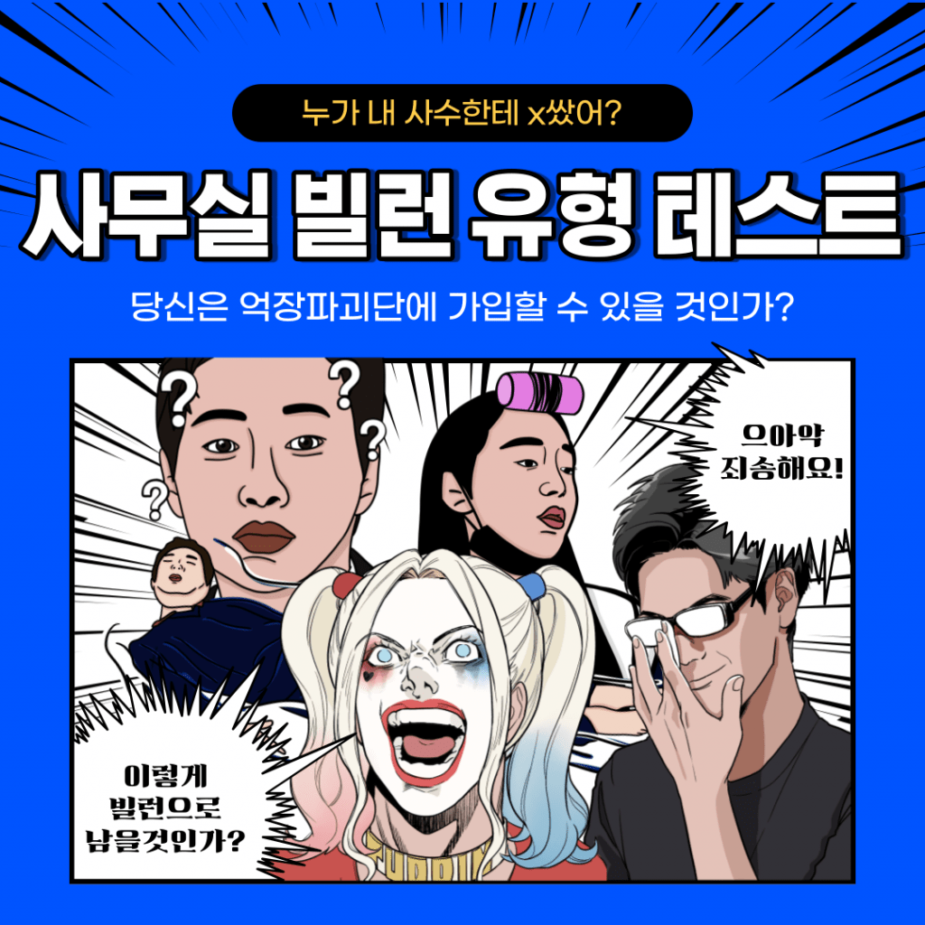 회사에서 내가 어떤 억장파괴단 인지 궁금하다면 ‘사무실 빌런 유형 테스트👽’ 이벤트에 참여해보세요! 신입사원으로 입사했을 때 여러 상황에 대한 반응을 통해 어떤 유형인지 판단해드립니다~✨ 지금바로 고고링~~