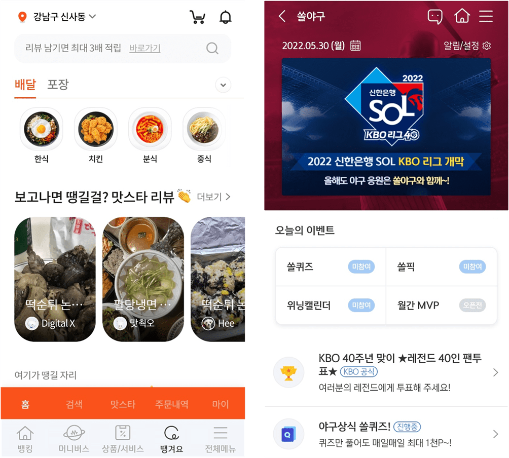 왜 은행 앱에 이런 부차적인 기능들을 넣는 걸까요? 괜히 앱이 더 복잡해지기만 하는 거 아닐까요? 사실 처음 ‘땡겨요’ 앱이 출시됐을 때만 해도, 다양한 접점을 통해 고객의 생활 데이터를 확보하려는 것 정도로 생각했는데요. 배달도, 야구 콘텐츠도 신한 쏠 앱 내에서 제공하는 것을 보니 또 다른 계획이 있는 것 같습니다.
