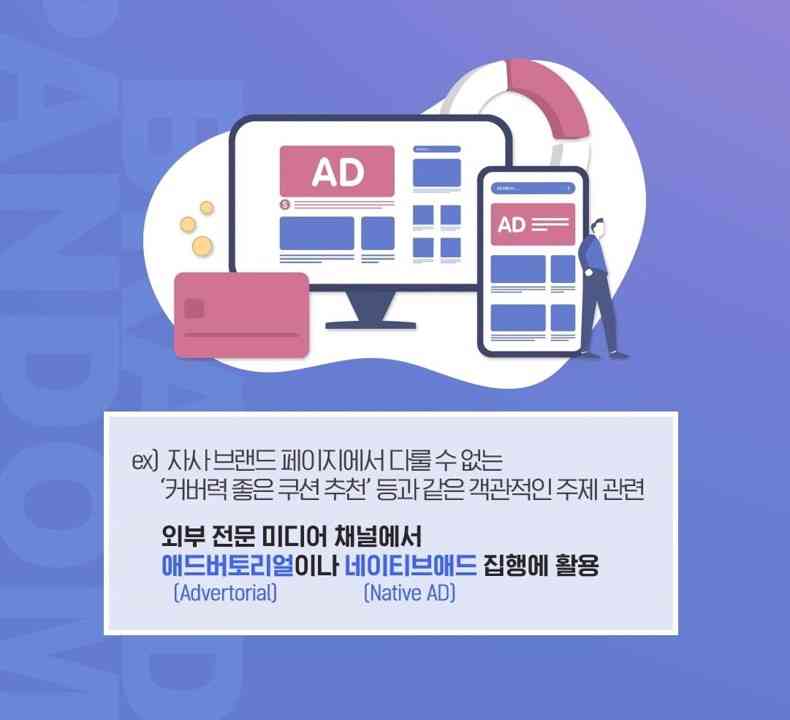 예를 들어 자사의 브랜드 페이지에서 다룰 수 없는 ‘커버력 좋은 쿠션 추천’ 등과 같은 객관적인 주제에 대해서 외부 전문 미디어 채널에서 애드버토리얼(Advertorial) 또는 네이티브 애드(Native AD)를 집행하는 데 활용할 수 있습니다.
