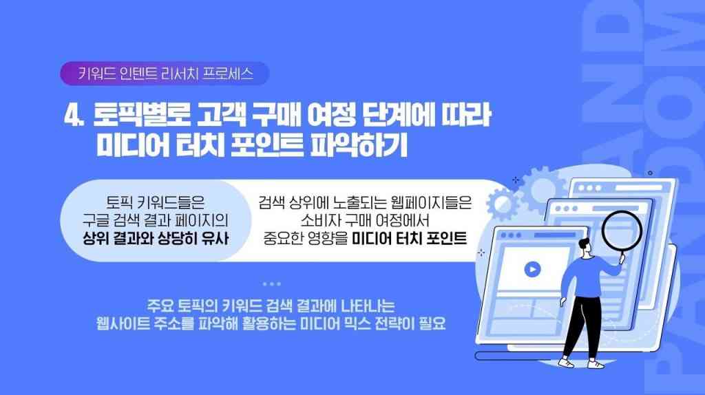 넷째는, 주요 토픽 별로 고객 여정 단계에 따라 미디어 터치 포인트 파악하기입니다.