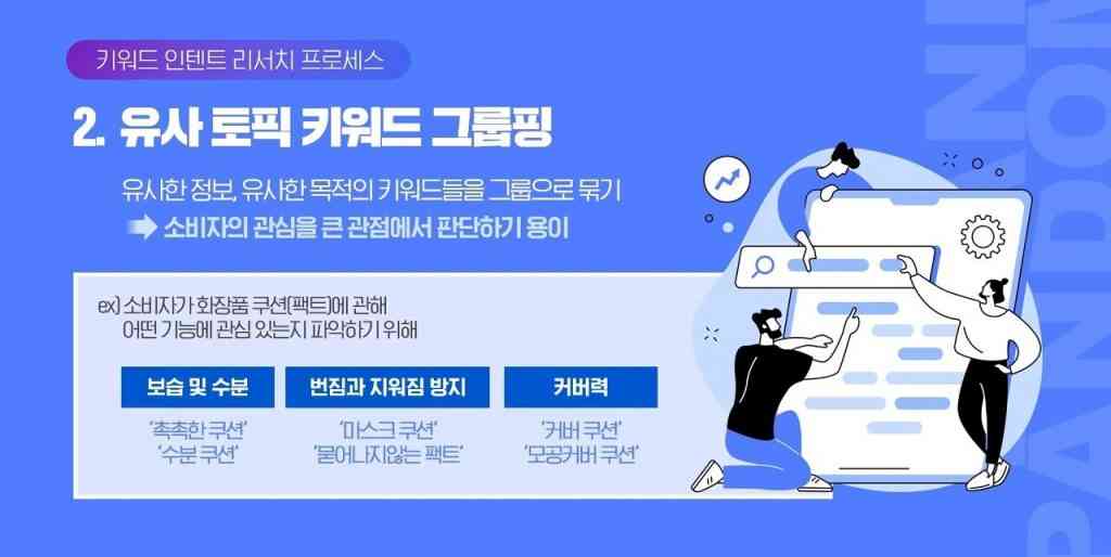 시드 키워드와 함께 연관된 키워드를 찾고 난 이후에 이들 키워드의 그룹핑을 진행합니다. 이를 통해서 유사한 정보를 찾거나 유사한 목적이 있는 키워드들을 그룹으로 묶어 소비자들이 어떤 것에 관심을 가지고 있는지 좀 더 큰 관점에서 쉽게 판단할 수 있습니다.