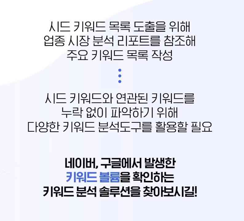 주요한 시드 키워드 목록을 빠짐없이 도출하기 위해서는 그 업종에 특화된 시장분석 리포트를 참조해 주요 키워드 목록을 작성해야 합니다.