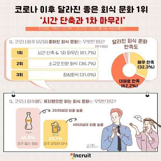 코로나19 거리두기로 인해 위축된 회식 문화는 이후 많은 변화를 겪었는데요. 개인 시간에 제약을 덜 받고자 밤보다는 낮 시간을 활용한 ‘점심 회식’과 문화생활을 즐기는 ‘문화 회식’을 하는 경우도 많아졌습니다. 이에 인크루트가 직장인 천여 명을 상대로 한 조사에서는 달라진 회식 문화에 90% 이상이 만족한다는 반응을 보이기도 했습니다. 이처럼 기존의 강압적이고 수직적인 회식 문화에서 벗어나 개인의 자율성을 존중받으며 수평적인 회식으로 문화가 변화하고 있습니다!