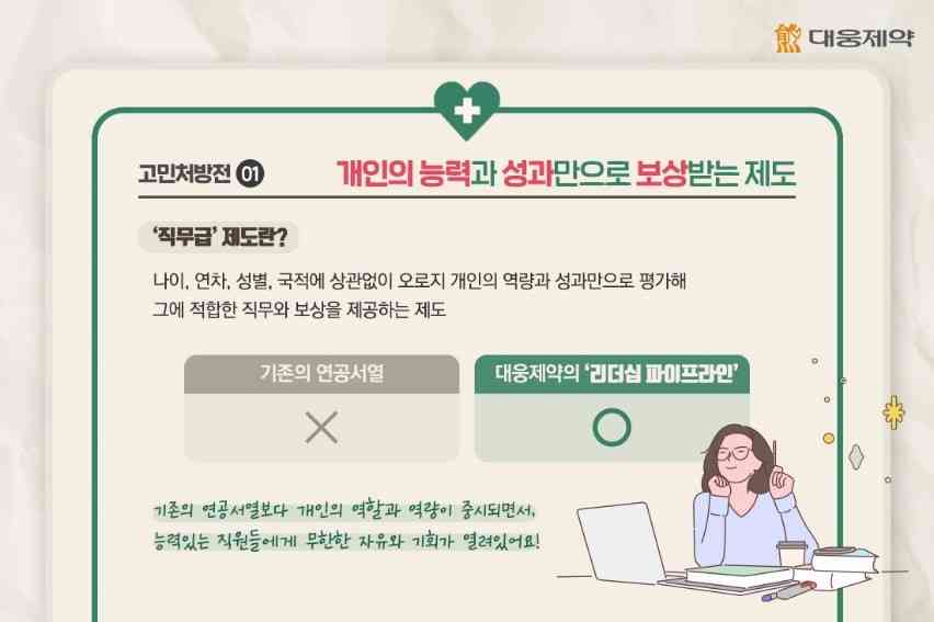 ‘대웅제약’은 ‘직원의 성장이 곧 기업의 성장’이라는 철학하에 직원의 성장과 몰입, 능력을 중심으로 기업 문화를 고수하고 있습니다. 나이, 성별, 근무연한과 관계없는 보직과 합당한 성과금을 지급하는 제도 등을 통해 직원들의 업무에 대한 자율성과 몰입감을 높이고 성장 기회를 가질 수 있도록 하고 있죠!