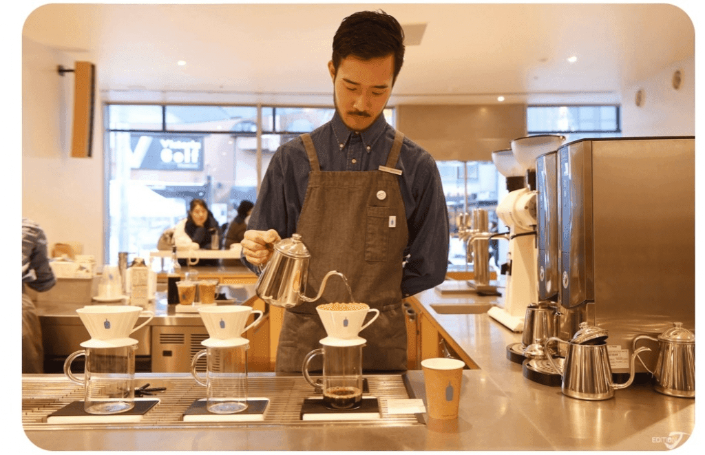 블루보틀의 환대는 스타벅스와 결을 달리한다. 창업자가 영향을 받은 국가가 이탈리아가 아닌 일본이라는 점이 크게 작용을 하는 것 같다. 블루보틀의 창업자 제임스 프리먼은 도쿄 시부야에 위치한 전통 있는 찻집 차테이 하토에서 깊은 감명을 받았다. 특히나 일본의 다도 문화가 커피를 만나 형성된 ‘깃사텐’ 문화에 말이다..