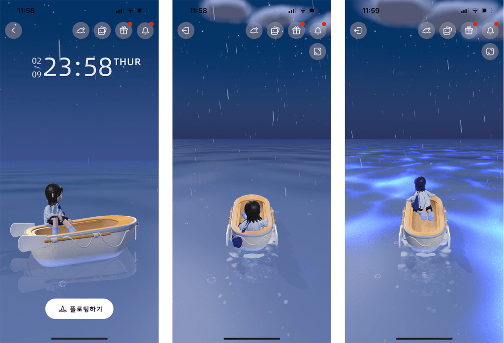 게임적인 기능을 추가해 특별한 재미를 더하기도 합니다. 본디는 기본적으로는 실제 친구와 친구를 맺는 것을 표방하지만, 동시에 모르는 사람과 소통하거나 친구를 맺을 수도 있습니다. 플로팅(floating) 기능을 활용해 항해를 하며 모르는 사람의 이야기를 듣고 소통할 수도 있습니다.
