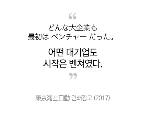 같은 이야기를 이렇게 썼다면 너무 당연해서 아무런 울림이 없었을 것이다. 그런데, 기업 초기의 작고 불안정한 상황을 기존 대기업들의 이미지에 어울리지 않는 “벤처”라는 개념으로 설명하니 전혀 다른 느낌이 되었다. 당연한 이야기를 당연하지 않게 하는 데 필요한 것은 시각을 살짝 바꾼 그 단어 하나였다. 벤처라는 단어를 가져온 카피라이터의 선택에 감탄하게 된다.