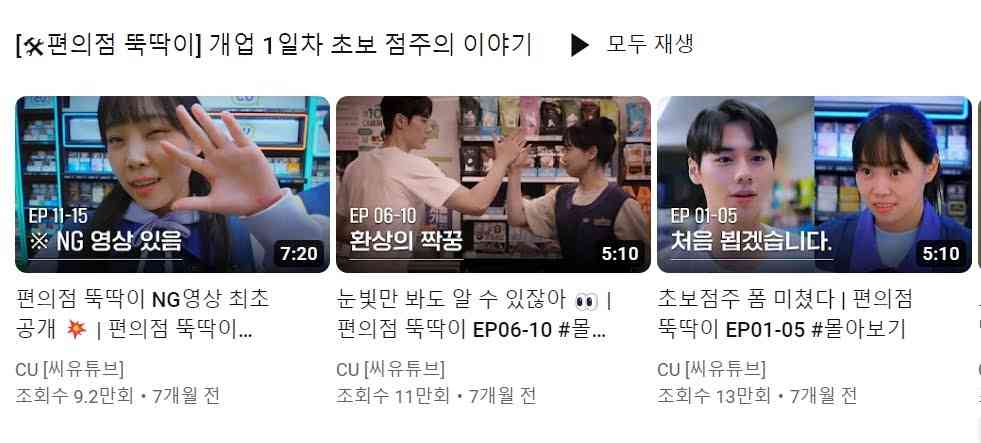 CU의 숏폼 드라마 <편의점 고인물>이 누적 조회수 1억 뷰를 기록하며 큰 인기를 끌었던 거 다들 아시죠?CU에서 후속작으로 선보인 <편의점 뚝딱이> 또한 회당 조회수 10만 이상을 기록하며 인기를 이어가고 있는 것도 알고 계신가요?
