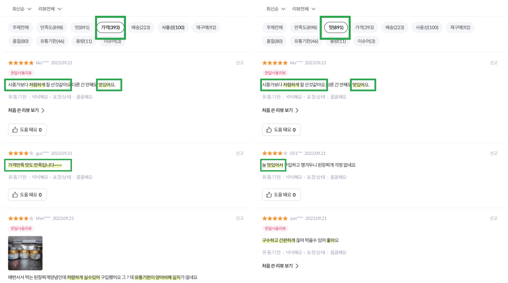 해당 주제에 맞춰 리뷰 내에 해당하는 문장 혹은 단어에 하이라이트를 해주므로 정보를 더 빠르게 확인할 수 있도록 해주고 있습니다. 개인적으로 한 가지 아쉬웠던 부분은 하이라이트 부분이 해당 키워드와 관련 있는 부분만 되어 있는 것이 아니었다는 점이었습니다. ‘저렴하다’와 ‘맛있다’가 동시에 하이라이트 되어있고 이는 ‘맛’ 키워드를 눌렀을 때도 동일하게 보인다는 부분이었습니다.