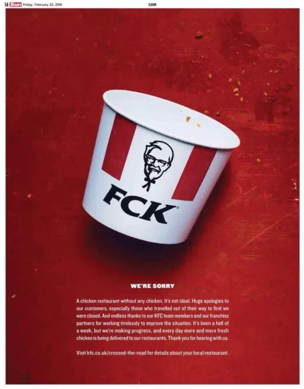 2018년 KFC는 영국에서 재료 공급망 문제로 수백 개의 매장에서 치킨 공급이 중단되는 위기를 맞았습니다. 치킨집에 치킨이 없으니 고객들은 경쟁 가게로 빠져나가고, 소셜미디어에 이 사실을 공유하기 시작했습니다. 이것에 대응하기 위해 KFC는 신문에 “FCK”라고 적힌 버킷 이미지와 함께 사과 광고를 실었습니다.(브랜드 알파벳의 순서를 바꿔서) 이 광고는 위기 상황에 유머러스하게 접근하면서도 진정성 있게 사과하는 방식으로 대중의 이해와 용서를 구했습니다. 이 사례에서는 위기 상황에서 유머를 적절히 사용하며 진정성 있는 사과를 하는 것이 소비자의 마음을 얻는 데 효과적일 수 있다는 것을 배울 수 있습니다.