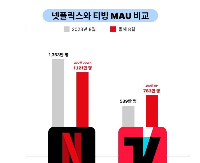 실례로 지난해 8월, 1,363만 명이던 넷플릭스 MAU는 올해 8월 1,121만 명으로 242만 명이 줄었는데요. 같은 기간 티빙 MAU는 589만 명에서 783만 명으로 200만 명이 증가했어요. 즉, OTT에 신규 이용자가 유입된 것이 아니라, 기존 이용자가 A 플랫폼 구독을 해지하고 B 플랫폼을 구독한 것인데요. 킬러 콘텐츠를 통한 플랫폼 간 파이 나눠먹기가 OTT 시장의 특징이라고 할 수 있어요.