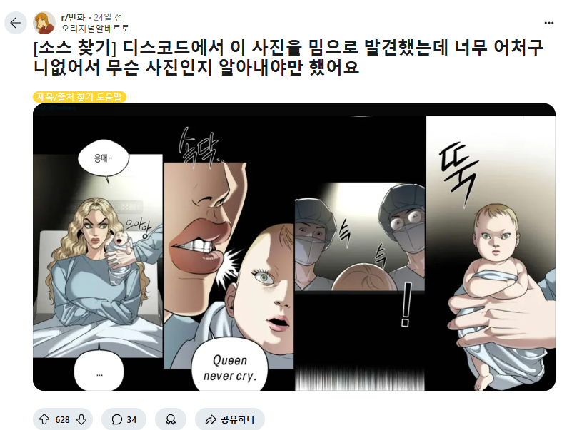 ‘퀸 네버 크라이(Queen Never Cry)’는 네이버 웹툰 ‘기자매’에서 탄생한 글로벌 밈이에요. 출산 직후, 아기 로라가 울자 어머니 세리나가 단호하게 “Queen never cry”라고 말하는 장면이죠. 아이의 다부진 표정.. 쉽지 않죠?😂 금손 작가님의 노력으로 태어난 강렬하고 유머 넘치는 이 장면이 독자들 사이에서 큰 인기를 끌며 해외 커뮤니티로도 빠르게 퍼졌어요.