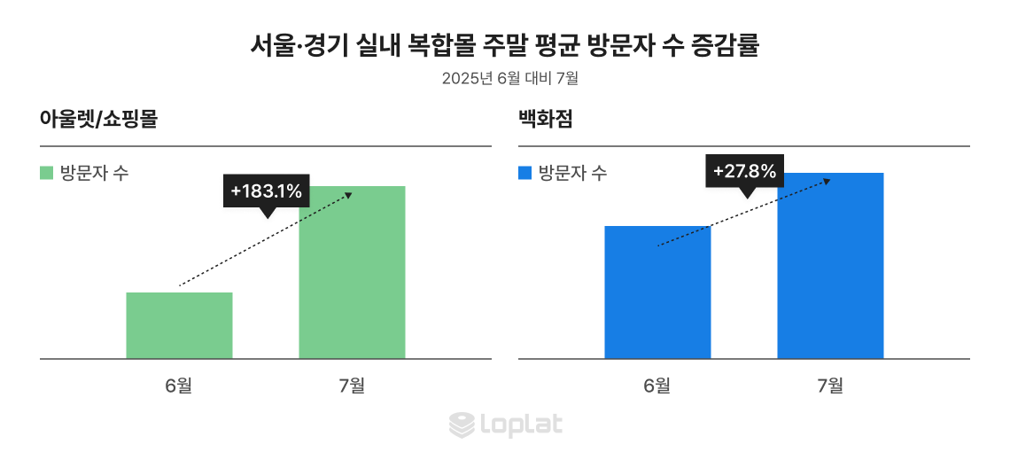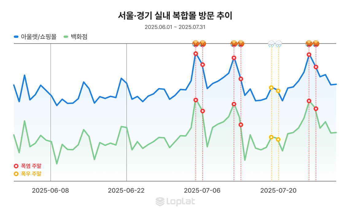 7월 폭염 시기에 실내 복합몰 전반에서 주말 방문이 크게 늘어났으며, 특히 아울렛·쇼핑몰이 백화점보다 훨씬 가파른 증가세를 보였습니다.