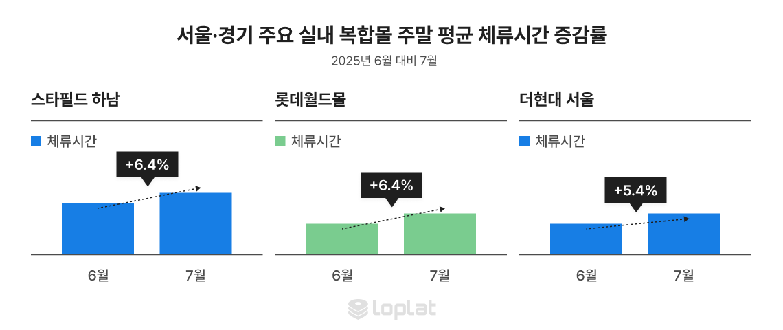 서울·경기 내 대형 실내 복합몰*(스타필드 하남, 롯데월드몰, 더현대 서울)의 주말 평균 체류시간은 6월 대비 다음과 같이 늘어났습니다.