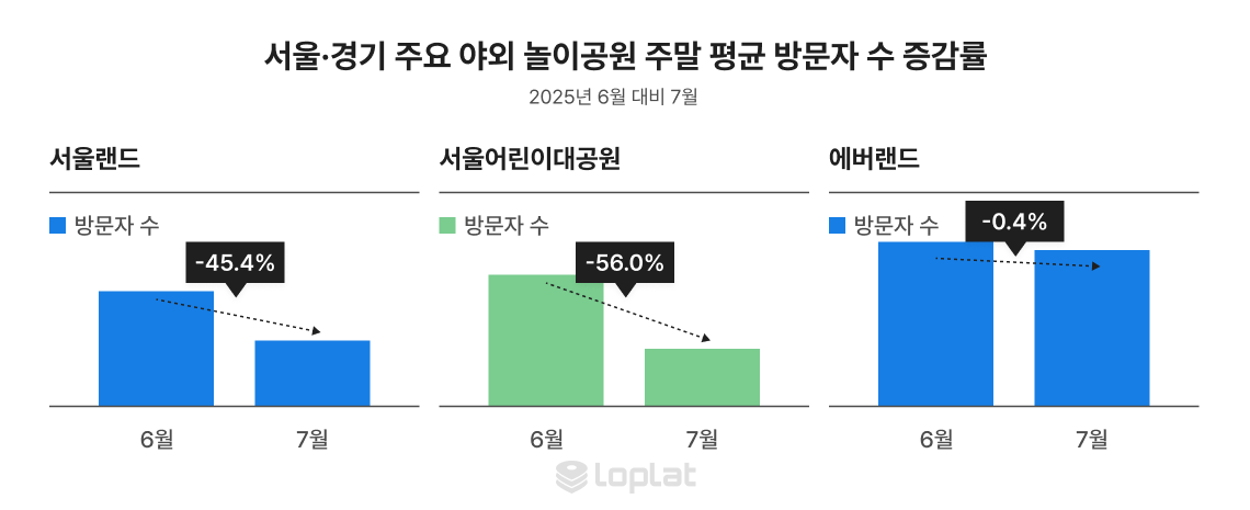 서울·경기권 대표 야외 놀이공원 3곳(서울랜드, 서울어린이대공원, 에버랜드)은 7월에 물놀이장을 운영하며 폭염 대응에 나섰지만, 에버랜드를 제외한 두 곳은 방문자 수가 줄어 폭염의 영향을 피하지 못했습니다.