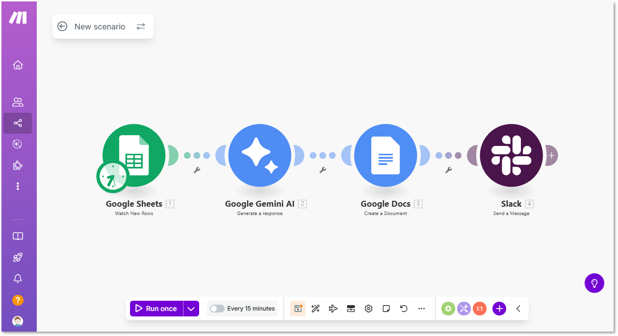 이제 설정이 완료되었으니 하단에 있는 실행 (Run Once) 버튼을 클릭하면 되는데요. 구글 시트에 입력되어 있는 주제를 읽어 와서 글을 작성한 뒤 슬랙으로 메시지를 보내는 것까지 확인되면 저장을 하면 되겠죠. 단, 우리는 시나리오를 설계했을 뿐 실행에 대한 예약은 하지 않았습니다. 실행 버튼 옆의 스케줄을 설정해서 실행 주기를 정해주면 됩니다.