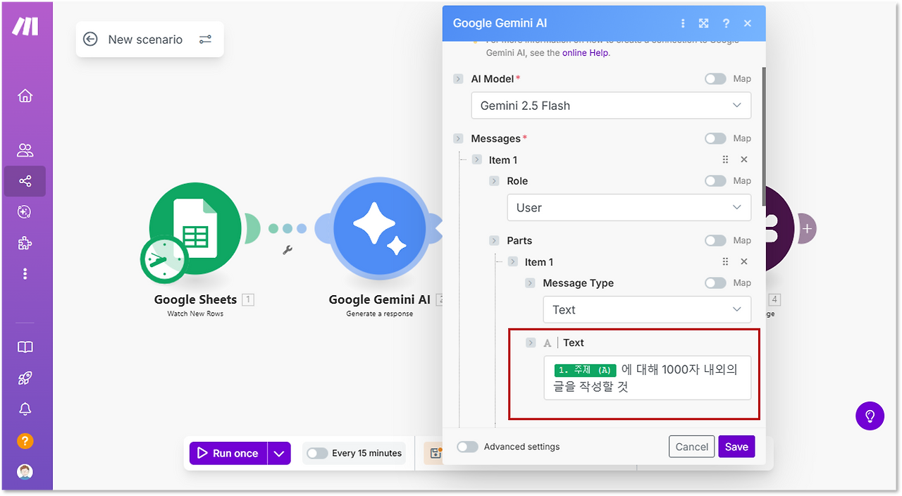 이제 Google Gemin AI 모듈을 선택하고, AI Studio에서 발급받은 API 키를 입력합니다. 프롬프트 입력란에 1단계 시트에서 가져온 '주제'를 연결하고, "이 주제로 1000자 내외의 글 초안을 작성해 줘"와 같이 입력하면 되는데요. 여기에 들어갈 내용은 우리가 제미나이의 프롬프트 창에 들어갈 내용과 똑같이 생각하면 됩니다. 구체적으로 지시할수록 좋은 결과를 얻을 수 있겠죠.