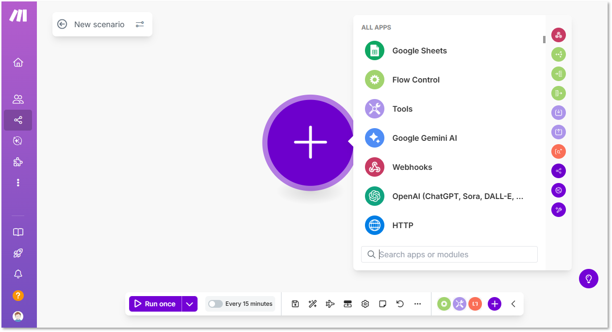 먼저 메이크닷컴에 접속을 해야겠죠. 가입을 한 뒤 'Create New Scenario'를 선택하면 아래와 같은 화면을 만날 수 있습니다. 우리가 노트북LM에서 새로운 노트북을 선택하면 소스 입력창이 떴던 것처럼, 메이크에서는 어떤 서비스를 연결할 것인지를 묻는 대기상태인 거죠.