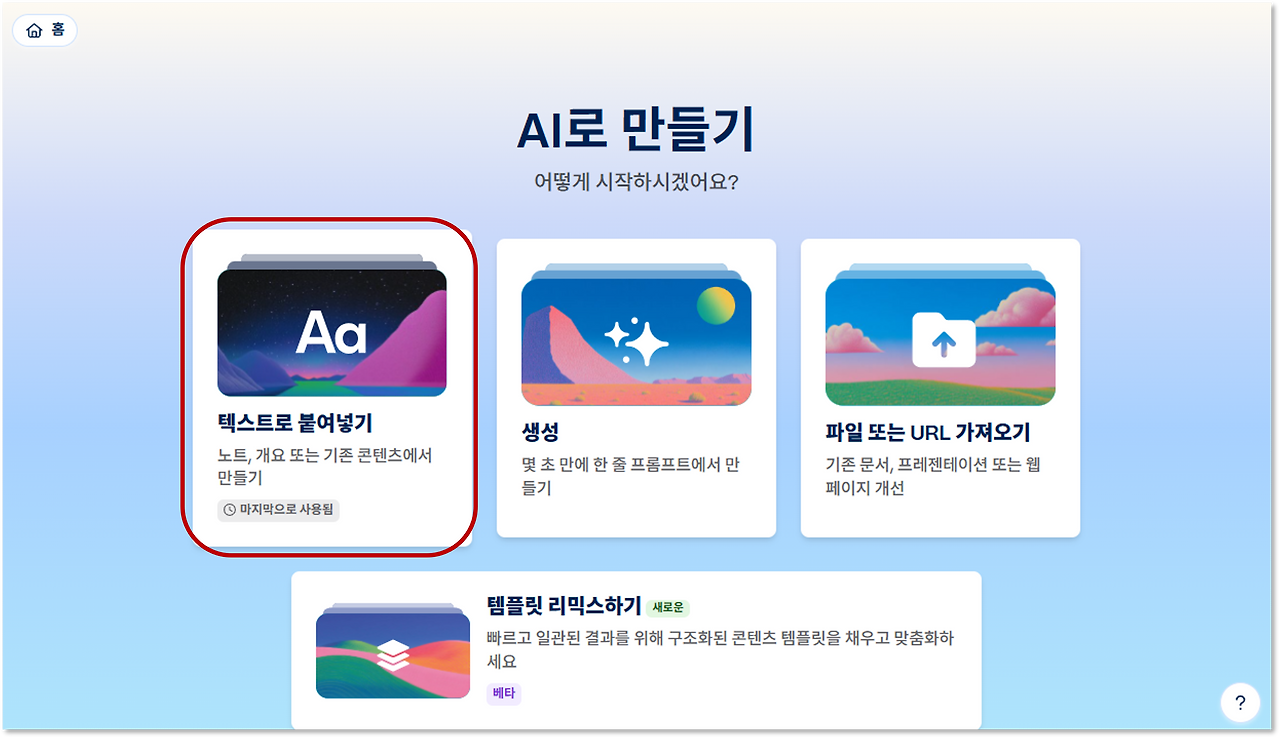이제 감마(Gamma.app)에 접속합니다. 새로 만들기를 클릭하고 AI에서 작성해 준 내용을 입력하면 되는데요. 우리는 텍스트를 확보했으므로 텍스트로 붙여 넣기를 선택합니다. (아래 왼쪽 그림)