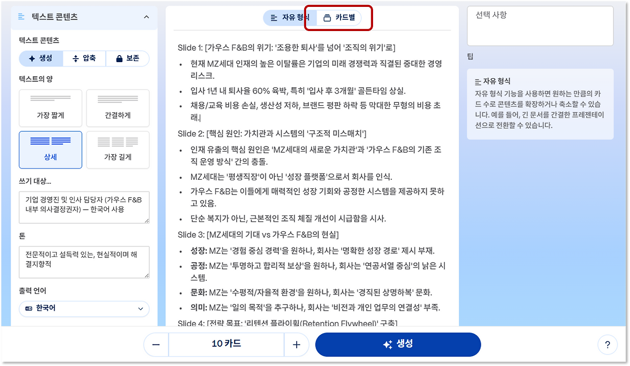 가운데 영역은 각 슬라이드(감마에서는 '카드')에 어떤 내용이 들어갈지에 대한 부분인데요. 만약 위의 이미지처럼 카드가 나뉘어 있지 않다면 상단의 '카드별'을 클릭하면 자동 분할을 할지 물어보게 되죠. 자동 분할이 되지 않는다면 분할할 부분에 '---'를 입력하면 됩니다. 단, 무료 버전은 10페이지 제한이 있다는 점은 생각해서 구성해야 하겠죠.