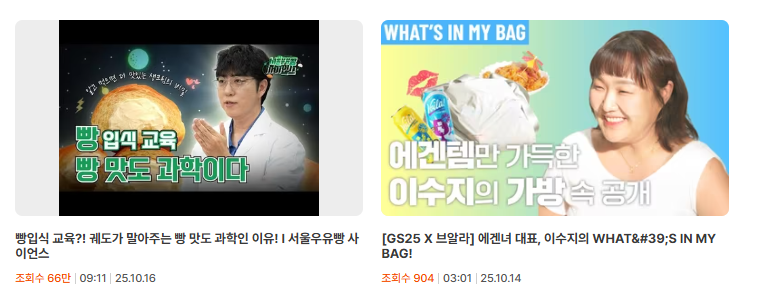 GS25 역시 ‘이리오너라’ 채널을 통해 ‘요리하는 돌아이’가 추천하는 편의점 레시피와 ‘궤도’와 함께 서울우유 빵에 대한 이야기를 재미있게 과학적으로 풀어 GS25의 상품을 중심으로 콘텐츠를 만들고 있죠.
