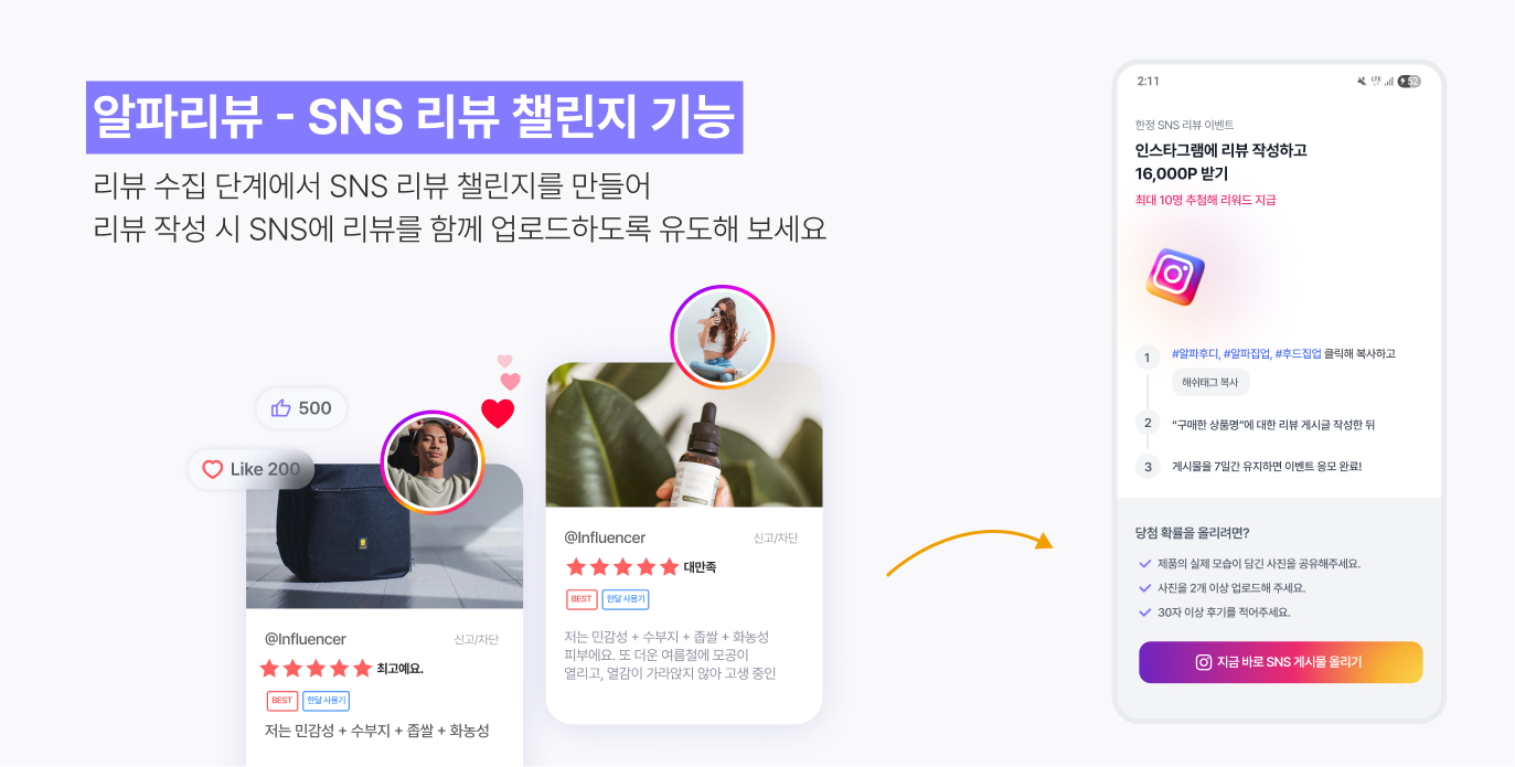 반면 인플루언서에게 투자할 비용이 마땅치 않는 쇼핑몰이라면, 알파리뷰 SNS 리뷰 챌린지 기능을 사용해 보세요. 리뷰 수집 단계에서 SNS 리뷰 챌린지 기능을 클릭하면, 고객이 리뷰를 작성할 때 SNS에도 리뷰가 업로드됩니다. 이후에는 챌린지 운영부터 혜택 지급까지 알파리뷰에서 자동으로 관리돼 브랜드사는 해당 챌린지를 직접 관리할 필요가 없습니다. 생생한 UGC 게시글을 빠르고 쉽게 만듦과 동시에 대형 이벤트를 만드는 데도 도움받을 수 있어요.