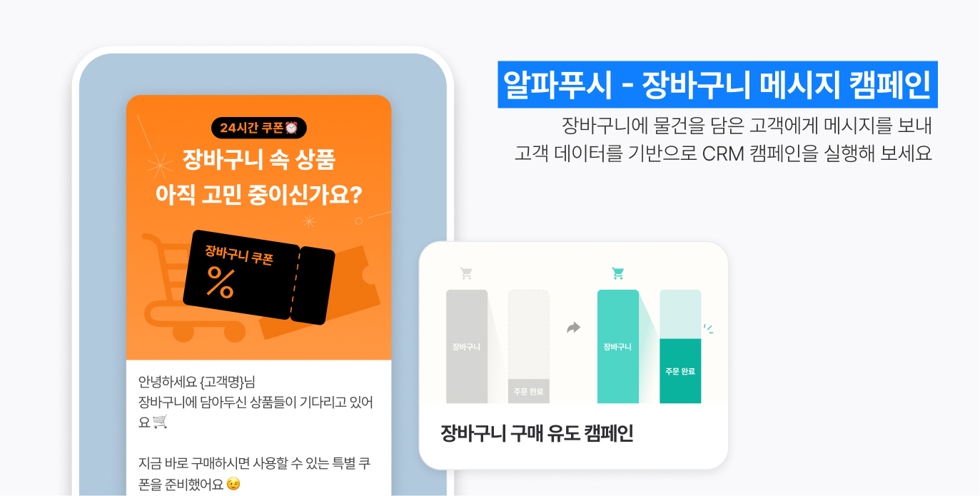 첫 번째, 장바구니에 물건을 담은 고객 대상으로 메시지 캠페인을 실행해 보세요. 블프 3주 전에 장바구니에 상품 담기 챌린지를 진행했다면, 장바구니 물품을 구매하게끔 하는 캠페인도 필요하겠죠. 사전에 기대감을 불러일으킨 액션과 함께 실제 구매 시 사용할 수 있는 혜택을 제공하는 것도 좋습니다. 핵심은 고객이 필요한 타이밍에 알맞은 쿠폰을 증정하는 것인데요. 이 점을 참고해 고객을 다양한 그룹으로 나눠 상황별 맞춤 메시지를 보내보세요.