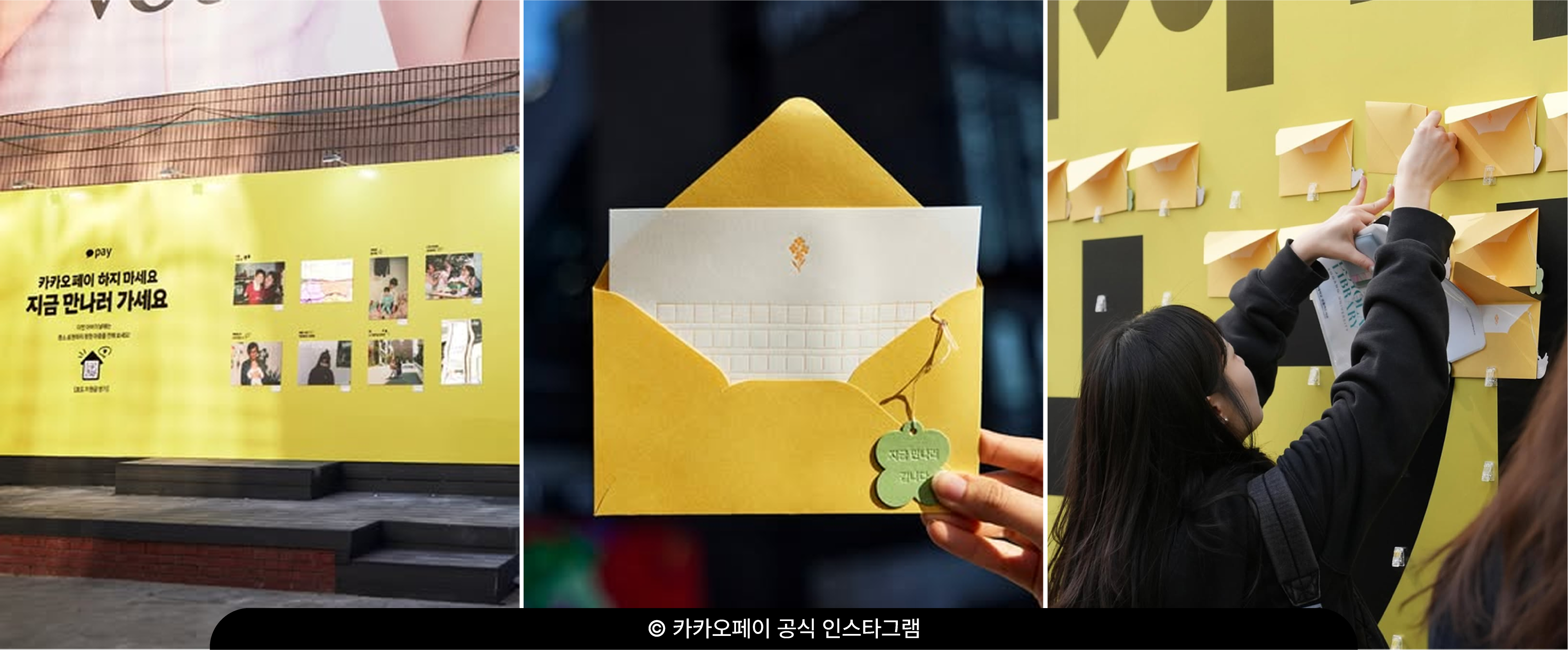 비대면 송금 서비스를 제공하는 브랜드가 오히려 ‘직접적인 만남’을 이야기한다는 점이 조금 의아하게 느껴지기도 하죠. 하지만 이 사례에서 주목할 부분은 제품·서비스 경험과의 정교한 연계성이에요. 광고판에 붙은 편지지 안에는 카카오페이 오프라인 첫 결제에 사용할 수 있는 할인 쿠폰이 들어 있었고, 앱에서는 어버이날 맞이 ‘효도 지원금’ 이벤트를 동시에 진행했어요. 감성에 집중해 따뜻한 브랜드 이미지를 전달하면서도, 실제 서비스 이용으로 자연스럽게 이어지도록 설계한 거죠.