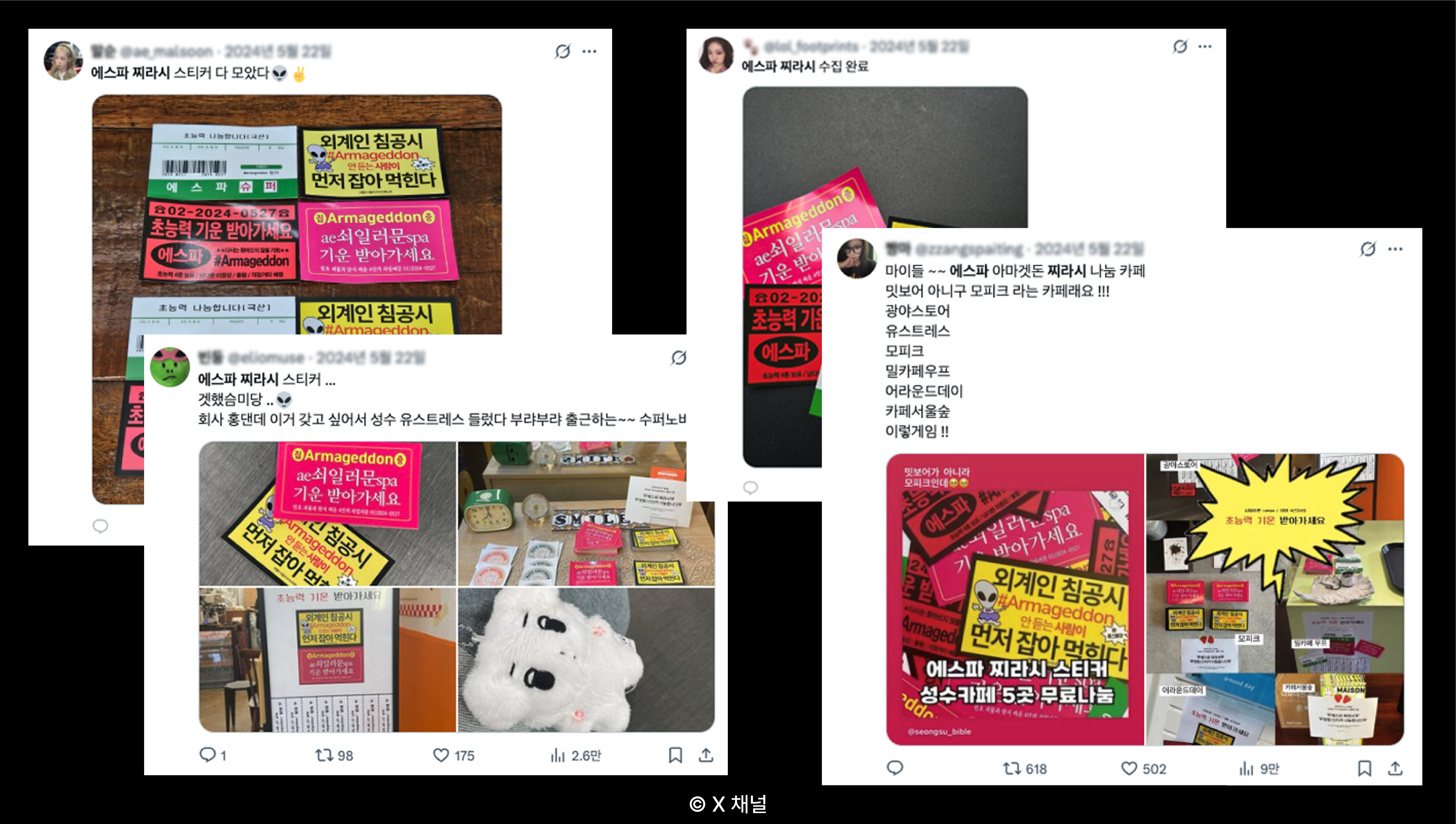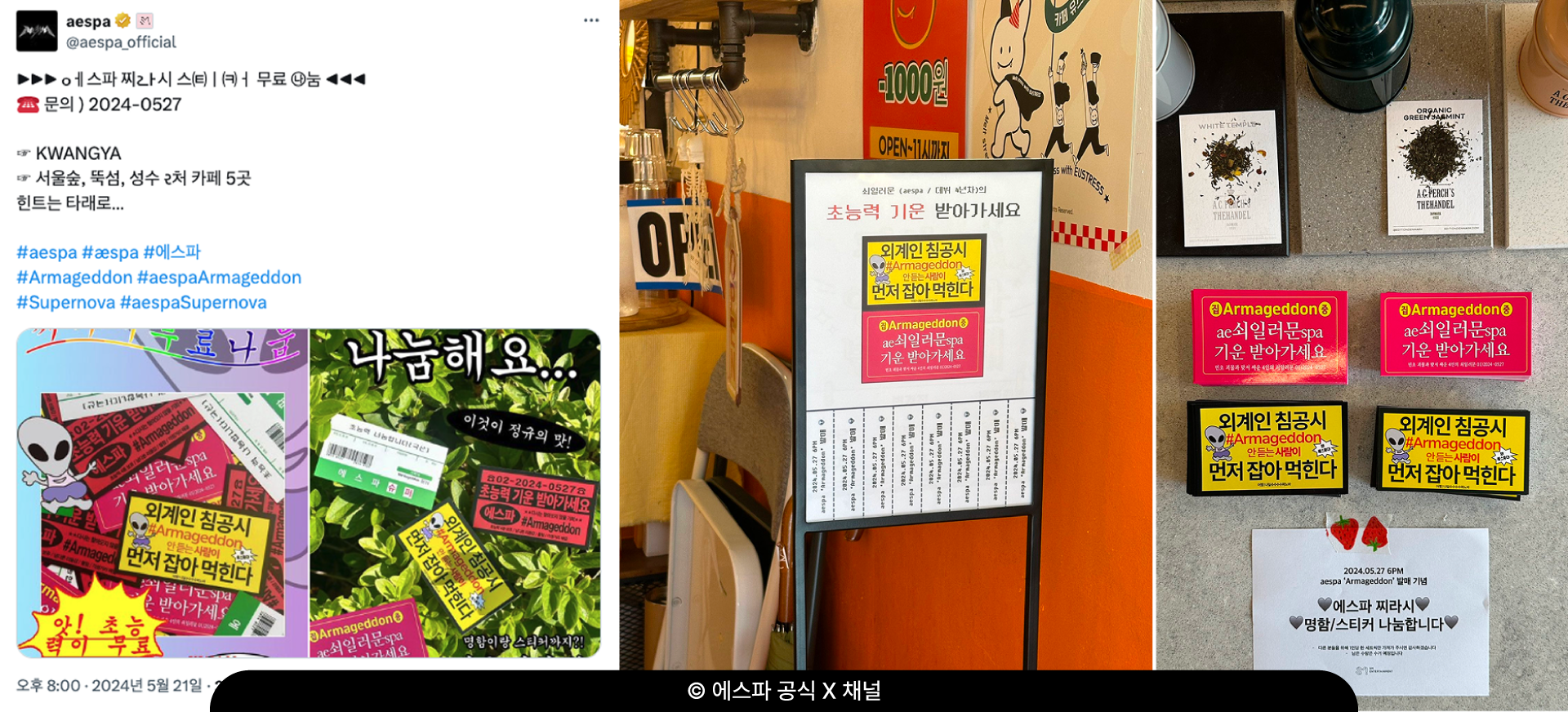 에스파는 정규 1집 <Armageddon> 발매를 앞두고 찌라시 밈을 패러디한 스티커 굿즈와 명함을 배포했는데요. 팬들에게 그냥 나눠주는 게 아니라 공식 인스타그램과 X에 장소에 관한 힌트만 제공하고 팬들이 직접 추리해서 찾아가도록 설계했어요. 굿즈를 둔 장소에는 하나씩 뜯어갈 수 있는 문어발 전단지도 두어 위트를 더했고요.