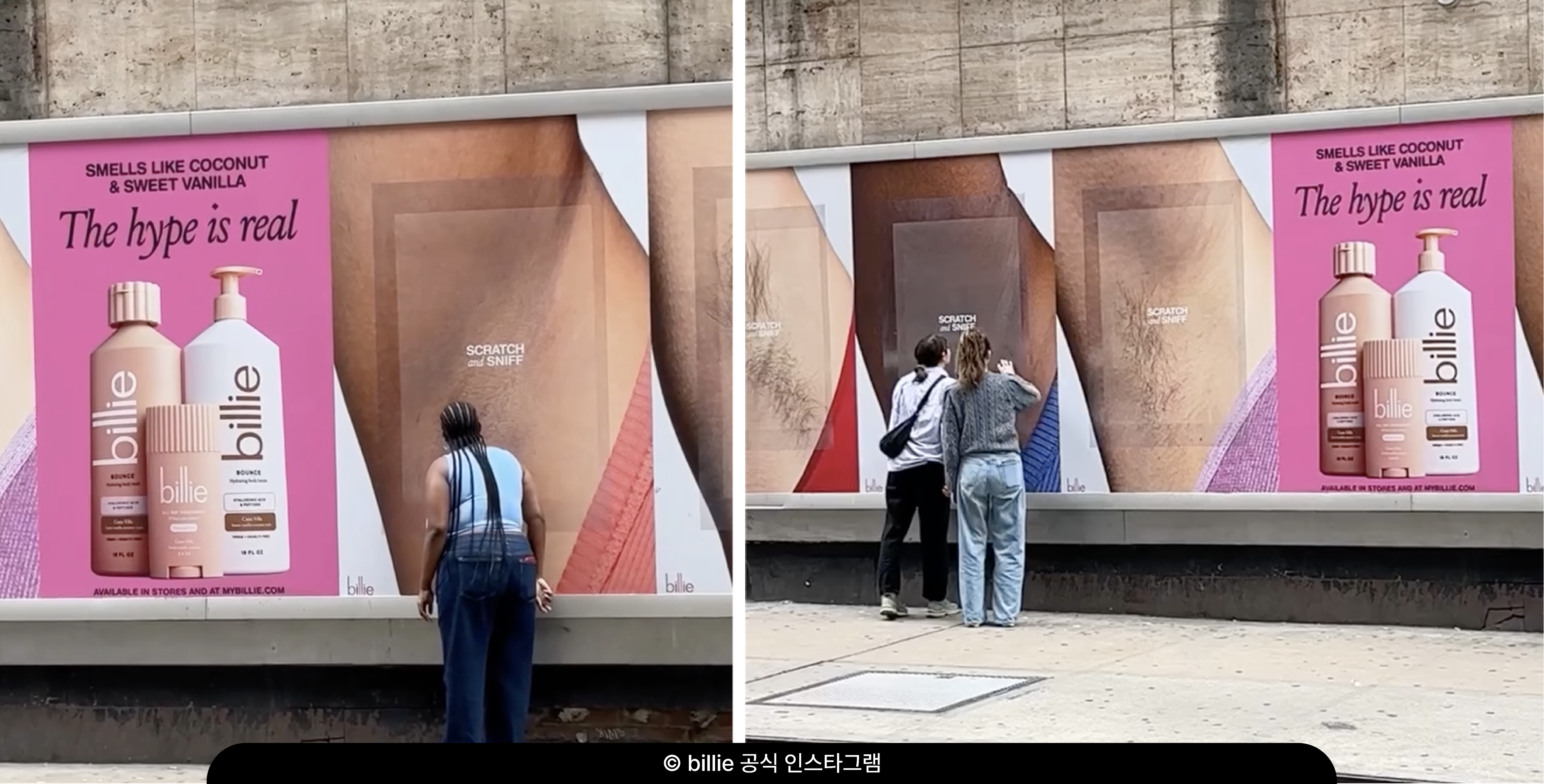 Billie의 옥외광고가 특별한 건 단순한 제품 홍보에서 더 나아가, 브랜드 철학을 감각적인 경험을 통해 어필했다는 거예요. Billie는 ‘체모는 자연스러운 것’이라는 철학을 갖고 있는데요. ‘시각(겨드랑이 이미지) + 촉각(긁는 행위) + 후각(향 체험)’을 동시에 자극하는 옥외광고를 통해 브랜드의 철학을 유쾌하면서도 강렬하게 어필했습니다.