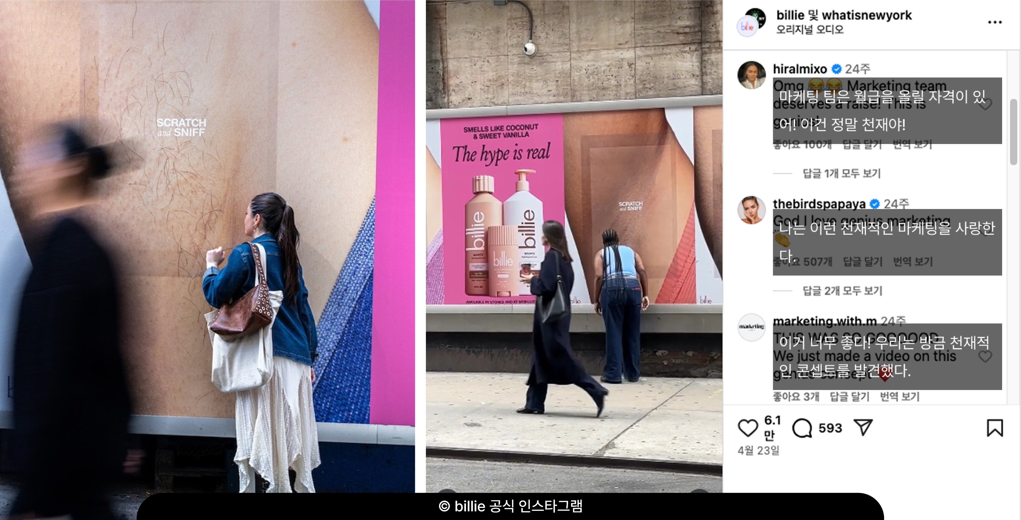 이러한 독특한 콘셉트 덕에 Billie가 게시한 빌보드 현장 영상은 순식간에 387.3만 뷰를 기록했어요. 또한 인스타그램과 틱톡에서도 사람들의 체험 영상이 활발하게 공유됐고요. 사람들은 "기발한 광고다", "마케팅팀 월급 올려줘라", "경험해 보고 싶다" 같은 긍정적 반응을 쏟아냈다고 해요.