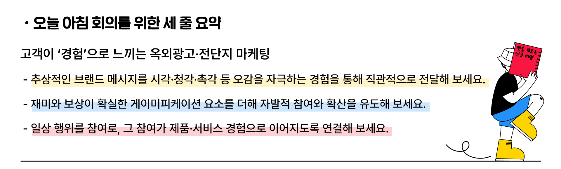 오늘 살펴본 국내외 사례들처럼 결국 중요한 건 광고를 ‘보게 만드는 것’이 아니라, 경험하게 만드는 거예요. 누군가의 일상 속 한 장면에서 자연스럽게 참여가 일어나고, 그 참여가 브랜드 경험으로 이어질 때 비로소 기억에 남는 오프라인 광고가 완성됩니다.
