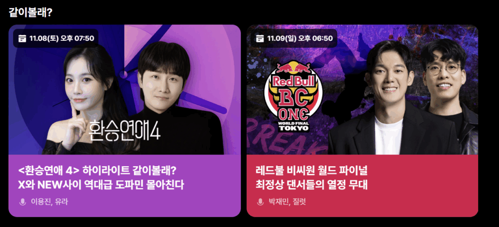 결국 크리에이터·오리지널·스포츠 팬덤을 ‘같이볼래?’라는 하나의 기능으로 엮어내며, 모두가 머물고 교류하는 올인원 팬덤 플랫폼을 완성하고 있습니다.