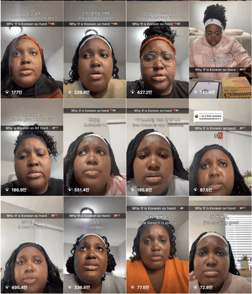 Tashie는 링고톡이라는 AI 회화앱과 한국어를 배우는 콘텐츠를 제작하고 있습니다. 특이한 점은 한국어가 왜 이렇게 어렵냐며 항상 눈물이 번져있고, Tashie의 발음을 들은 AI 튜터는 잔인할 정도로 비웃거나 비꼬죠. 튜터의 이런 냉소적인 대답에 Tashie가 항상 울음을 터뜨리며 끝이 납니다. 한국어를 배우는 외국인의 고충을 지켜보는 한국인들은 ‘안타까움’과 ‘가학적인 유머’ 사이의 복잡한 감정선을 느끼게 됩니다. 놀라운 점은 첫 콘텐츠가 업로드된지 2개월도 되지 않았는데, 팔로워는 3.1만 대비 거의 모든 콘텐츠의 조회수가 100만을 넘는다는 겁니다.