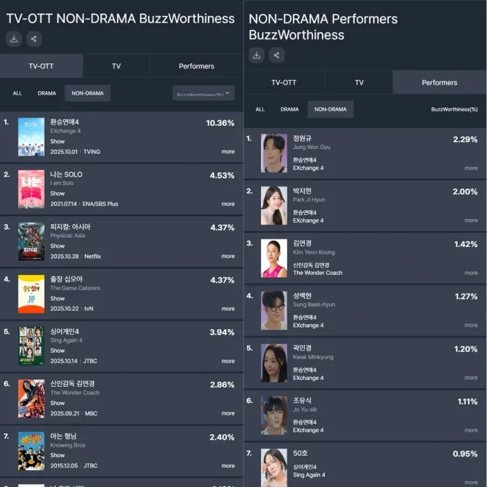 특히 이번 주 리스트에서 음악 · 예능형 콘텐츠 · 연애프로 세 가지를 중요하게 볼 수 있는데요!