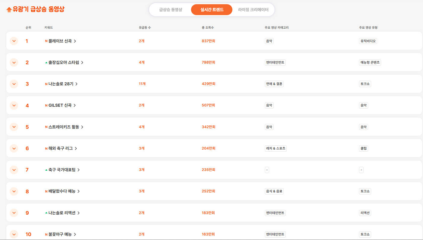 유급동의 실시간 트렌드를 보면 지금 유튜브가 어디에 반응하고 있는지가 단순 인기 목록이 아니라 “실시간 관심도 흐름”처럼 읽히는 특징이 있습니다.