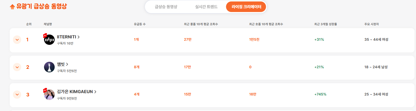 그럼 최근 실시간 트렌드와 라이징 크리에이터 분석 내용을 소개해 드릴게요!
