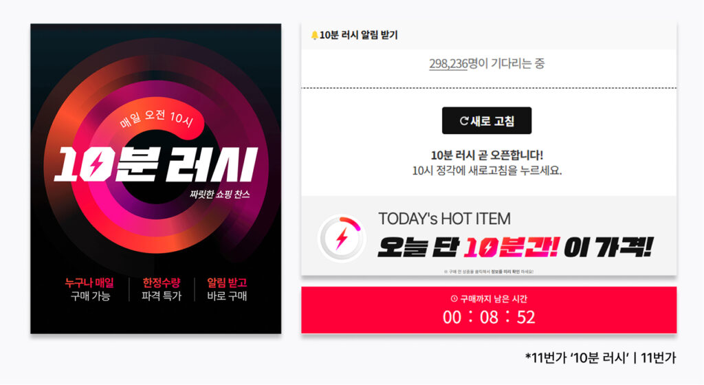 11번가는 하루 딱 10분 동안 한정 특가 상품을 판매하는 ‘10분러시’를 운영하며 9개월 만에 누적 거래액 110억 원을 달성했습니다. 제한된 시간 동안 진행되는 판매는 소비자들의 즉각적인 참여를 유도하며 알림 신청 수만 28만 명에 달할 정도로 큰 관심을 얻었죠. 또 60분 동안 진행되는 ‘60분 러시’도 단기간에 누적 거래액 50억 원을 기록하며 FOMO 마케팅의 효과를 입증했어요.
