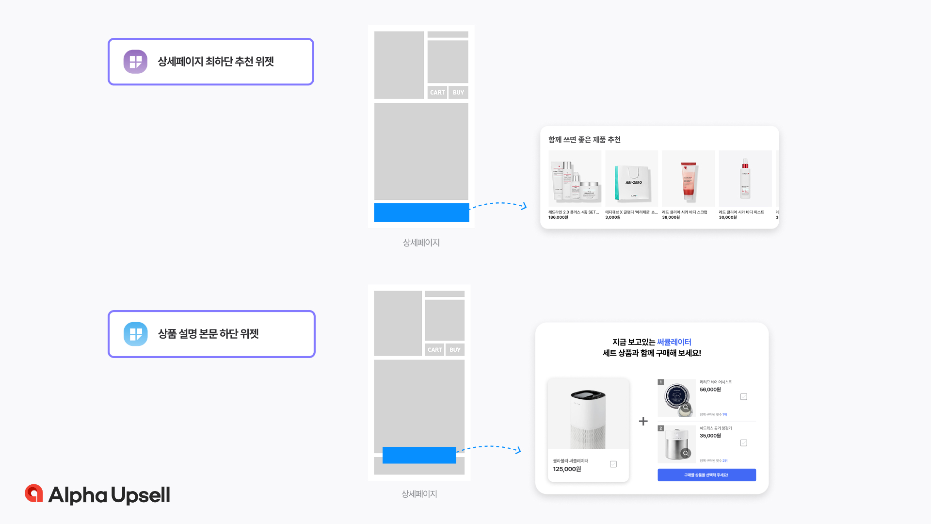 고객이 상품을 둘러볼 때, 구매버튼 근처에서 업셀링할 수 있는 다른 상품을 보여주거나 상세페이지 하단에서 함께 구매하면 좋은 제품으로 세트 상품을 보여줄 수 있습니다. 또한, 장바구니 페이지로 이동했을 때 상품을 추천하거나 상세페이지를 다 보고 나가려고 하는 고객에게 상세페이지 최하단에서 제품을 추천할 수 있죠. 중요한 점은 고객이 쇼핑몰의 어떤 위치에 있든, 최적의 인터페이스로 상품 추천을 진행해야 한다는 것입니다. 끊임없이 더 다양한 상품을 적절한 맥락에서 보여주고, 구매하고 싶은 마음이 들게끔 하는 것, 그것이 상품 추천 솔루션을 사용하는 가장 큰 이유입니다.