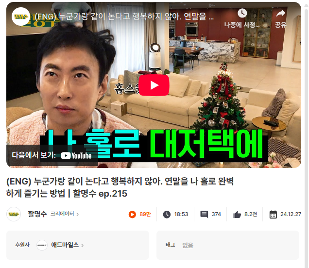 작년에는 본인 집을 공개하면서 트리도 만들고, 밥도 해 먹고, 소소한 연말 루틴을 보여줬죠.