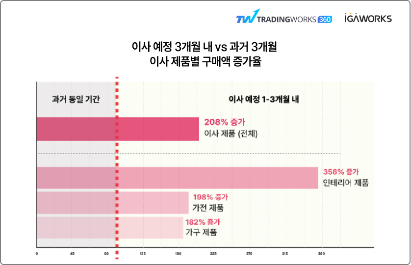 이사 예정자들의 이사 제품 구매율을 확인해 본 결과, 1~3개월 내 이사 예정자의 이사 제품 구매액이 과거 동일 기간 대비 2.08배 증가했습니다. 세부 제품군별로는 인테리어 제품 358%, 가전 198%, 가구 182% 증가하며, 구매가 고르게 증가한 것을 확인할 수 있었습니다.