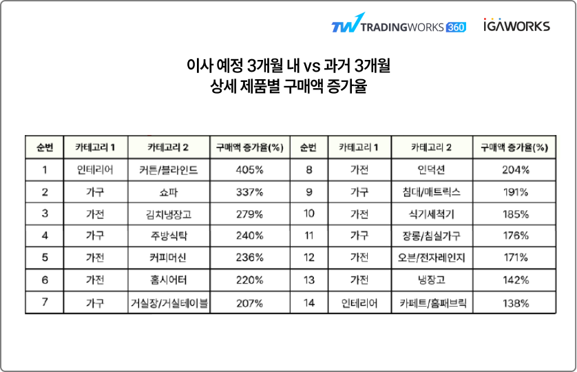 특히 구매 증가율 1위 인테리어(커튼/블라인드), 2위 가구(쇼파), 3위 가전(김치냉장고)로 나타나, 이사 제품 전반에서 단순 관심이 아닌 실제 구매로 이어질 가능성이 높은 고정밀 오디언스로 검증되었습니다.