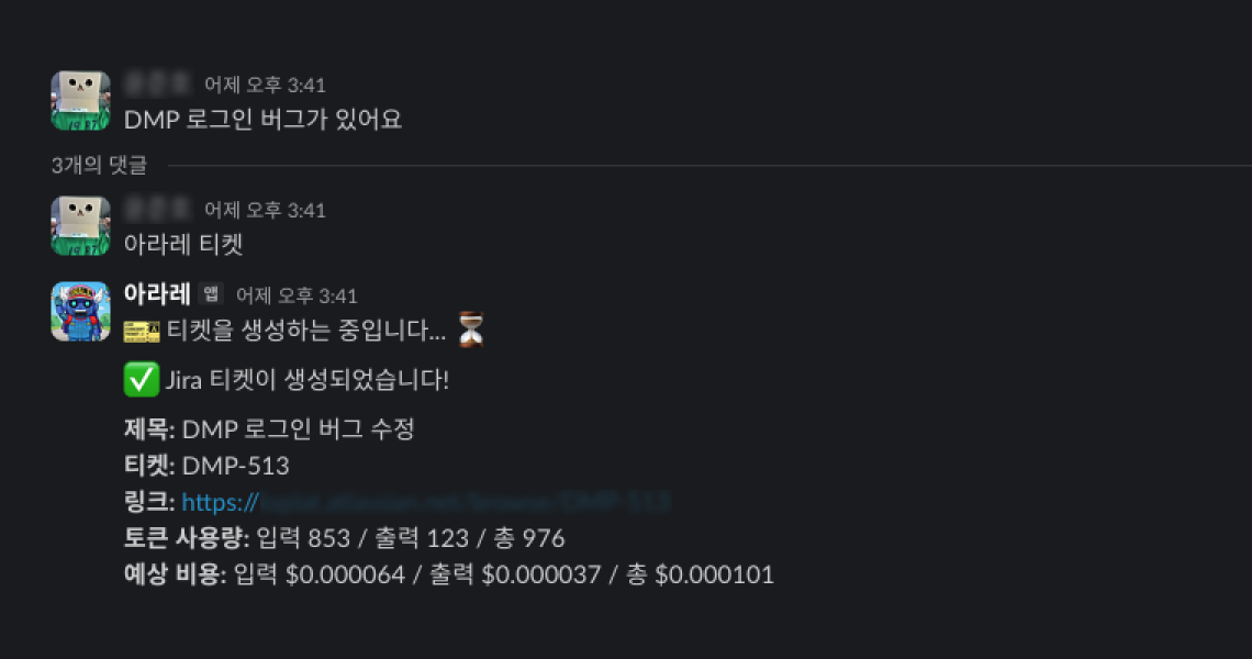 또, 슬랙에서 '@아라레 + 티켓'를 호출하면 대화 내용을 분석해
